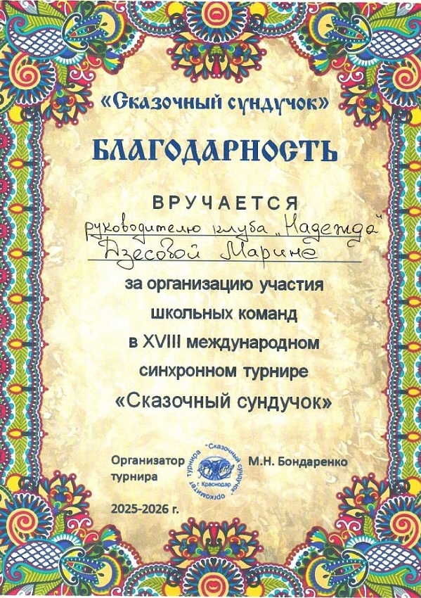 В декабре 2025 и январе 2026 интеллектуальный клуб гимназии №5 «Надежда» принял участие в XVIII международном турнире «Сказочный сундучок» - сезон 2025-2026г. В нем приняли участие 1688 команд из 152 городов 4 стран.