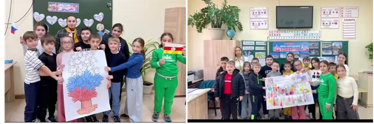 Для детей была организована познавательно‑развлекательная программа «Мы разные — и в этом наша сила!». Они раскрашивали яркие эскизы костюмов представителей разных национальностей, проживающих в нашей большой стране.